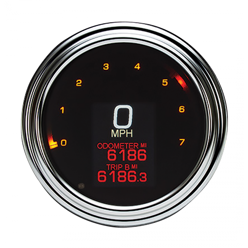 Features include an adjustable speedometer (selectable as MPH or km/H), bar-type tachometer with adjustable shift point, voltometer, cylinder temp (when available), clock, gear position, odometer with two trip meters, service meter, hour meter plus security and low fuel indicators. Performance readings such as high speed and RPM recall, 0-60 time, 1/4 mile time and speed, and numeric RPM readout, can also be accessed in the two-line message center. Gauge display automatically dims for comfortable night time riding and brightens to a high contrast mode for excellent visibility, even in direct sunlight.