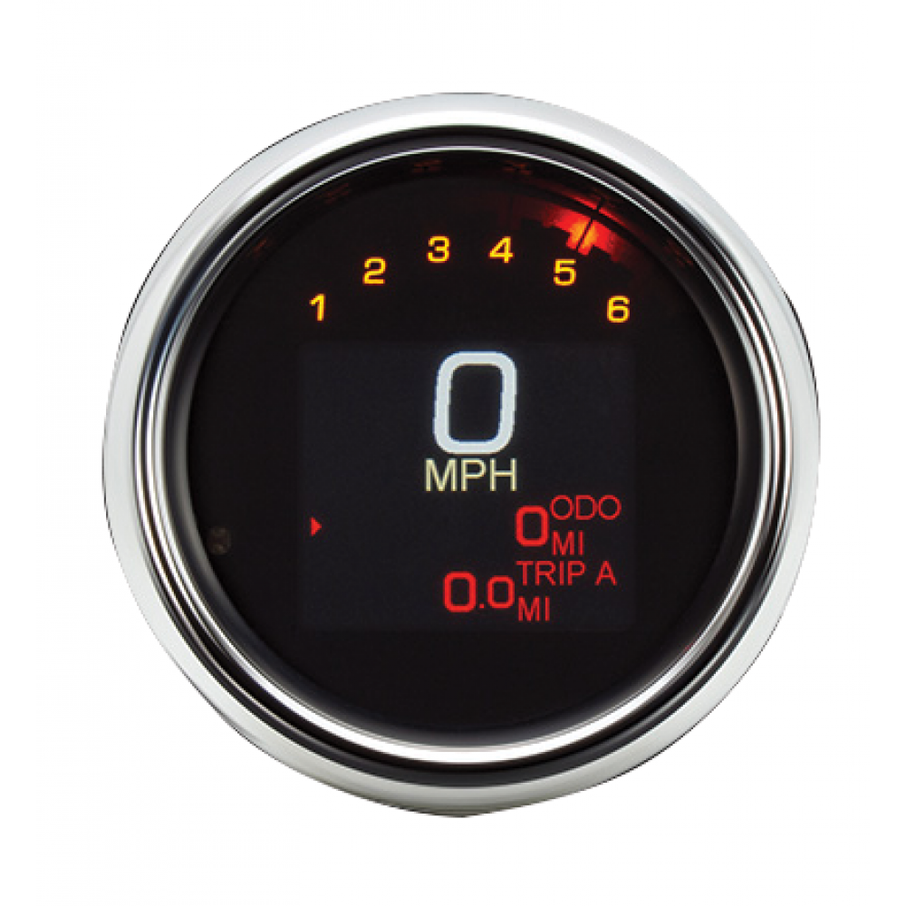 Features include an adjustable speedometer (selectable as MPH or km/H), bar-type tachometer with adjustable shift point, voltometer, cylinder temp (when available), clock, gear position, odometer with two trip meters, service meter, hour meter plus security and low fuel indicators. Performance readings, such as high speed and RPM recall, 0-60 time, 1/4 mile time and speed, and numeric RPM readout, can also be accessed in the two-line message center. Gauge display automatically dims for comfortable night time riding and brightens to a high contrast mode for excellent visibility, even in direct sunlight.
