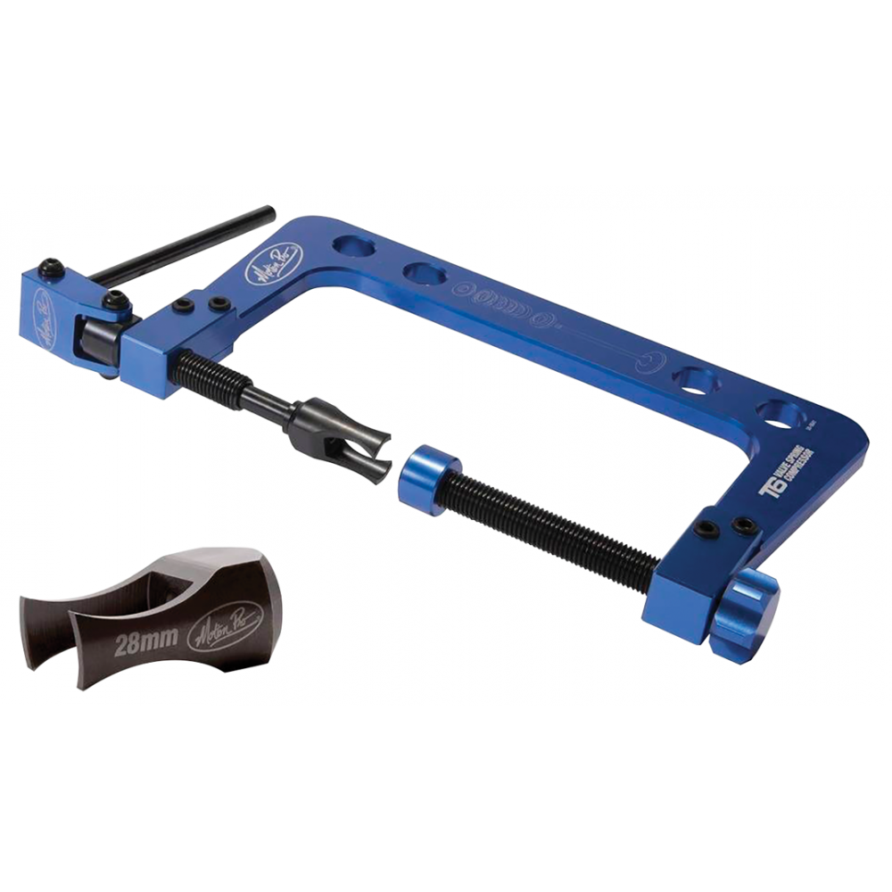 Quick release system presses straight against the retainer to eliminate side loading the valve and keepers Works on all motorcycle, Milwaukee-Eight, ATV, UTV, and small engine cylinder heads Billet 6061 aluminum frame provieds unmatched strength, stiffness, and lower weight Fully adjustable top and bottom Aluminum lower adjuster will not damage or scratch valves Includes two universal fork style tips (24mm and 28mm outside diameter) Durable blue anodized finish with laser engraved markings Simple, fast, and easy to use Motion Pro