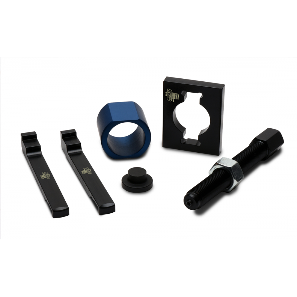 The Milwaukee-Eight has a new crankshaft oil seal that is difficult to remove without potentially damaging the crankcase bore. This tool is designed to do the job right with no chance of damage to the case. Simply insert the removal fingers over the engine output shaft and then slide the lock collar over the fingers. Once assembled, you can easily remove the seal square to the bore by simply turning a wrench.
