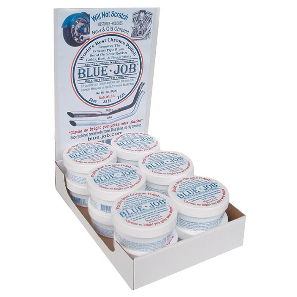 Restores chrome without scratching. Removes the blues, golds, rust, road tar and burnt on shoe soles from chrome or stainless steel exhaust pipes. Also works great for polishing brass, copper, and silver. Will not scratch or dull exhaust like other blue removing products. Since Blue-Job leaves no oily residue behind and resists finger prints, it is highly recommended for pretreating new exhaust systems. Each 1 ounce (28 gram) container includes a polishing cloth and instructions. Sold in Package of 12 counter display. Made in the USA. BLUE JOB?