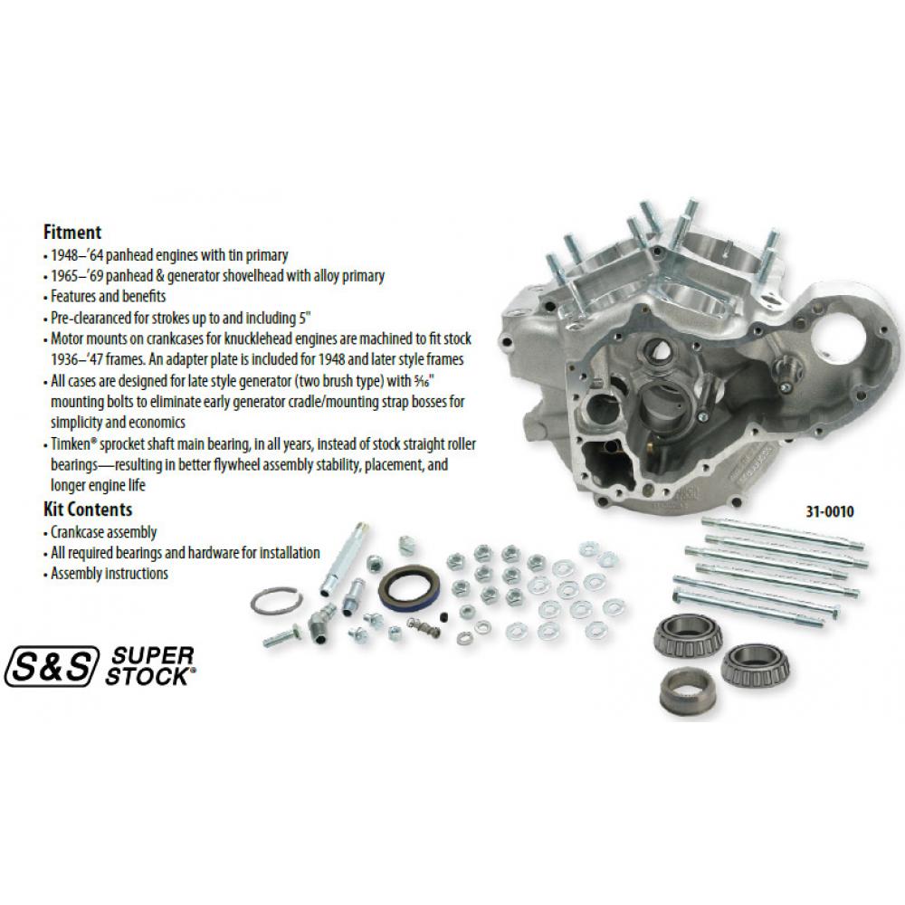 Generalized Note #2: Engines for 1936–’64 chassis with tin primary must use a 1955–’64 style inner primary cover. Since all S&S generator style crankcases use 1958 and later style main bearings, stock flywheel assemblies 1957 and earlier cannot be used in S&S crankcases. Flywheel assemblies must have 1958 and later pinion shaft with 1.250" diameter bearing, and a 1954 and later style sprocket shaft designed for a Timken® main bearing. Generator style cases for 1936–’47 knucklehead engines are machined to supply oil to the heads from a boss located near the rear tappet guide or from a stock or S&S gearcover. Provision for oil scavenging from the heads in these crankcases is the same as stock, with passageways that connect the tappet guides to the crankcase breather gear. Crankcases for 1948–’69 engines are machined with a provision to separate the oil supply to the top and bottom ends if an S&S oil pump is used. This feature lets you choose the 1972 and earlier stock "side oiling" system or the 1973 and later split oil system. The stock cast iron oil pump can be used for the "original look" and stock oiling system. If an S&S billet oil pump, part #31-6200 is used, the oiling system can be set-up as stock or updated to a split system. 1963–’65 panhead engines, with outside oil supply lines to the cylinder heads, must use the oil supply port located behind the rear tappet guide or the oil fitting toward the rear of the S&S gearcover. S&S generator style crankcases do not have the stock style "outside oiler" oil supply boss, so special oil supply lines will need to be fabricated.