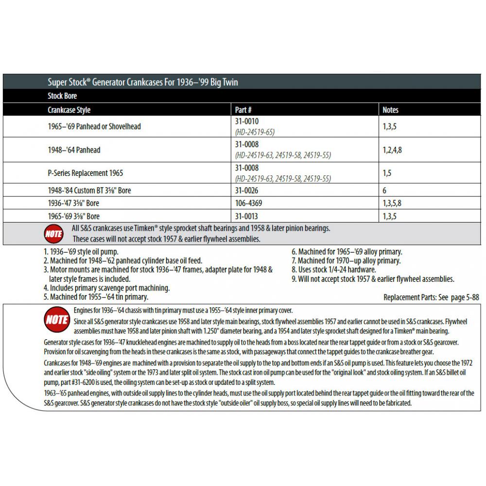 Generalized Note #1: All S&S crankcases use Timken® style sprocket shaft bearings and 1958 & later pinion bearings. These cases will not accept stock 1957 & earlier flywheel assemblies.