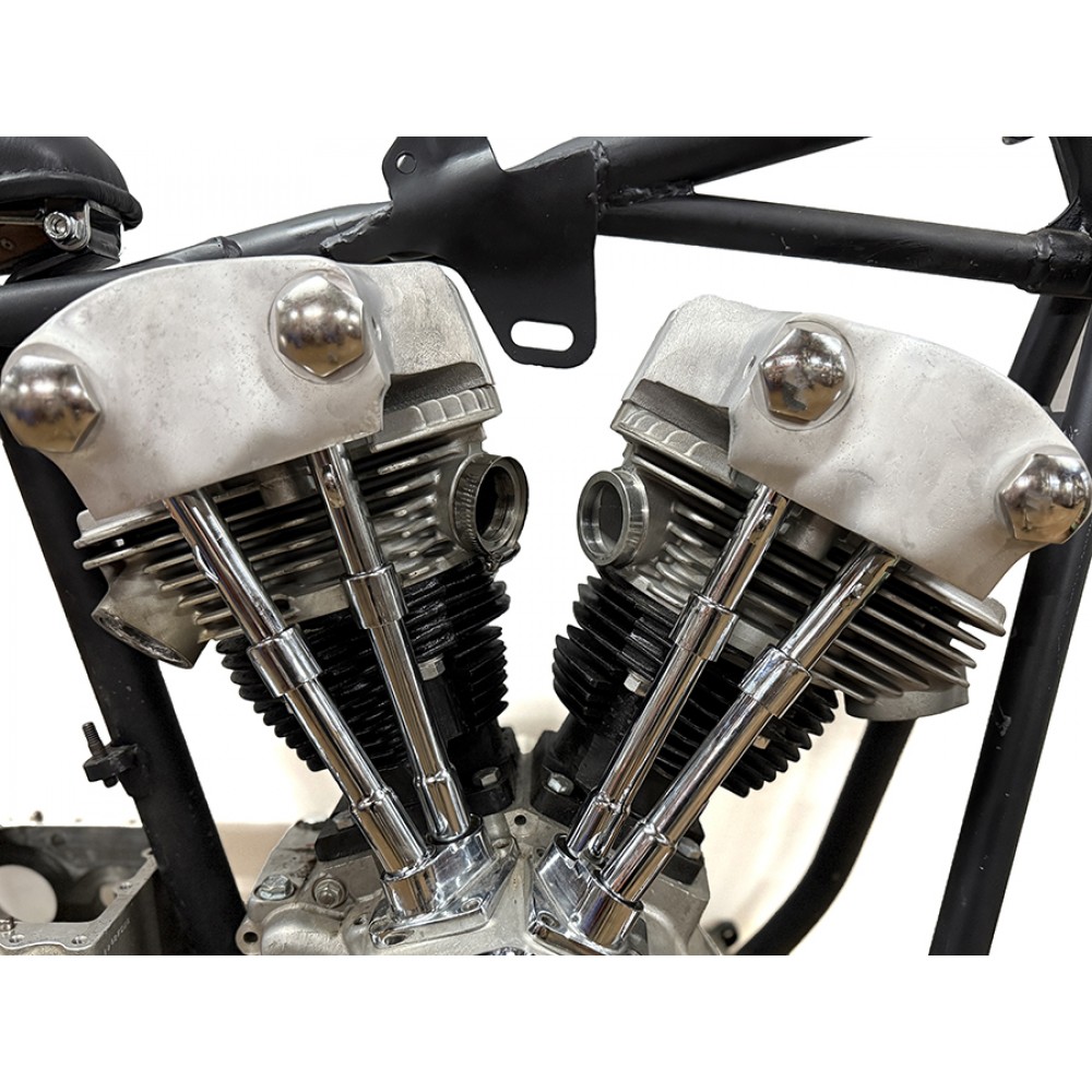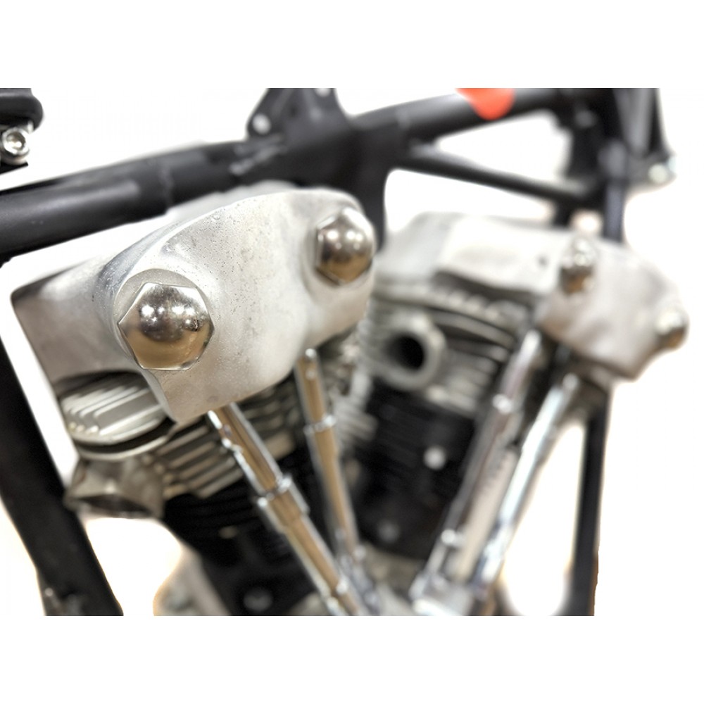All internals fit these retro rocker boxes. Natural cast finish main body is supplied, which readily accepts paint or can be polished to match the Knucklehead end covers that are polished. Chrome hex plugs thread on the Shovelhead rocker box shafts. Requires stainless steel top OHO oil line, nuts and shafts. Rocker box end is polished. Sold as a pair, front and rear. *NOTE: Internal cavity will require hand fitting of the rocker arms and shaft. Extra clearance must be provided for full rocker arm motion!