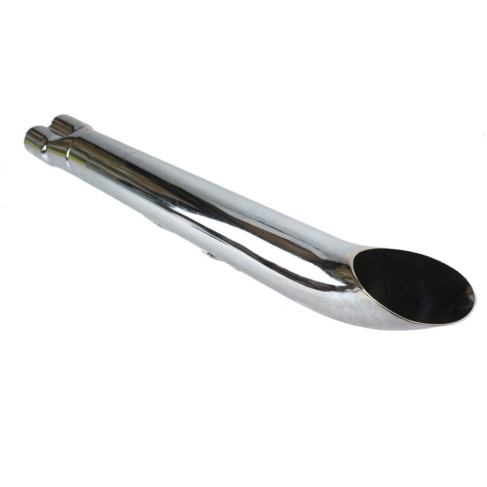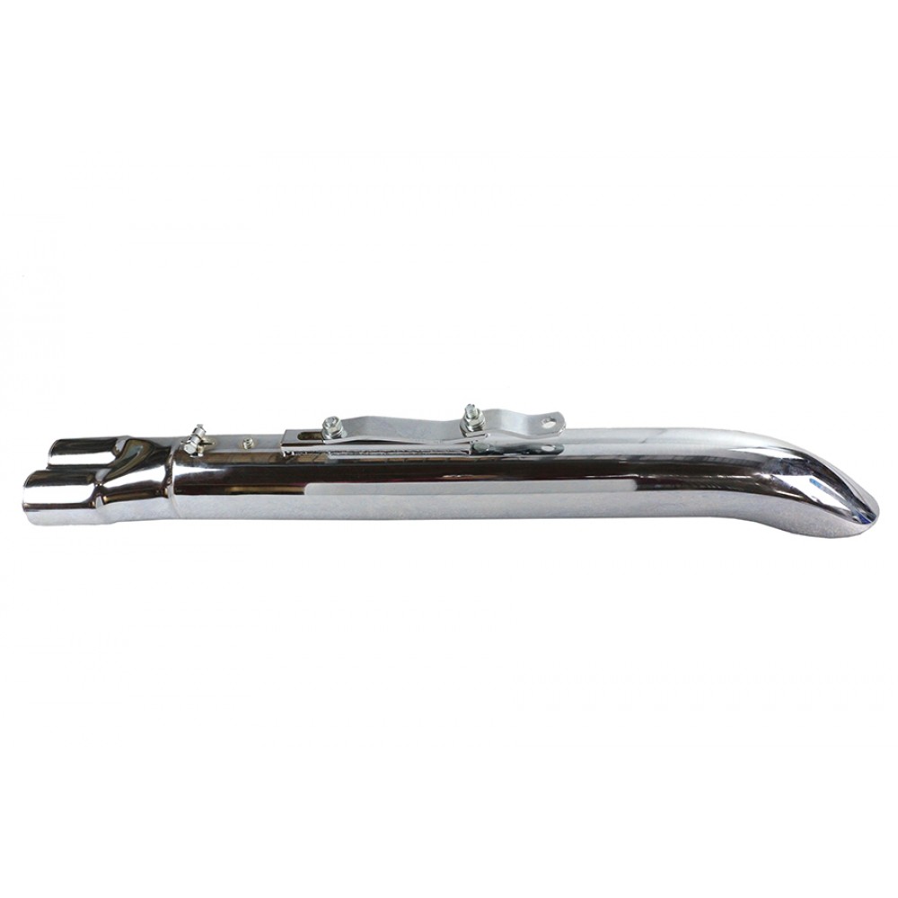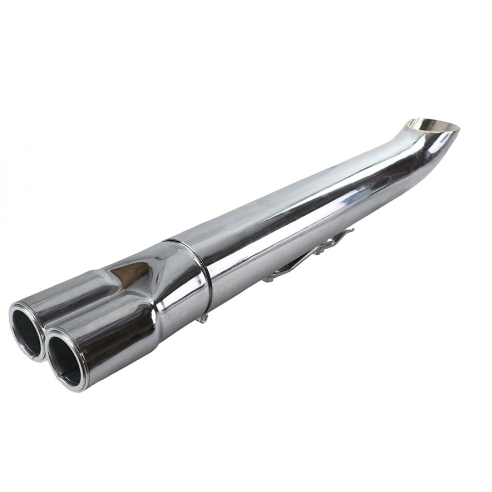 Universal 24" two into one turn out collector muffler has a 3" body diameter. Inlet inner diameter is 1-3/4". Muffler is for most parallel exit pipes. Features a chrome finish.