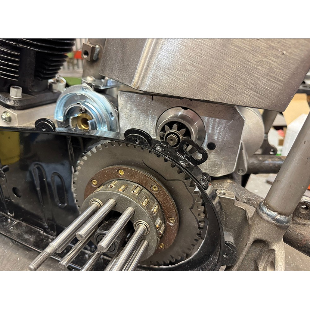 For use with tin inner primary. Must be trimmed to fit installation, inner and outer primary covers not included. Starter pinion gear engages with ring gear that is attached to the clutch hub. Starter motor is mount to ratchet top with screw provided, vent screw included. *NOTE: Recommended to use horseshoe oil tank style. Mount with alternations or brackets as necessary, for required clearance.