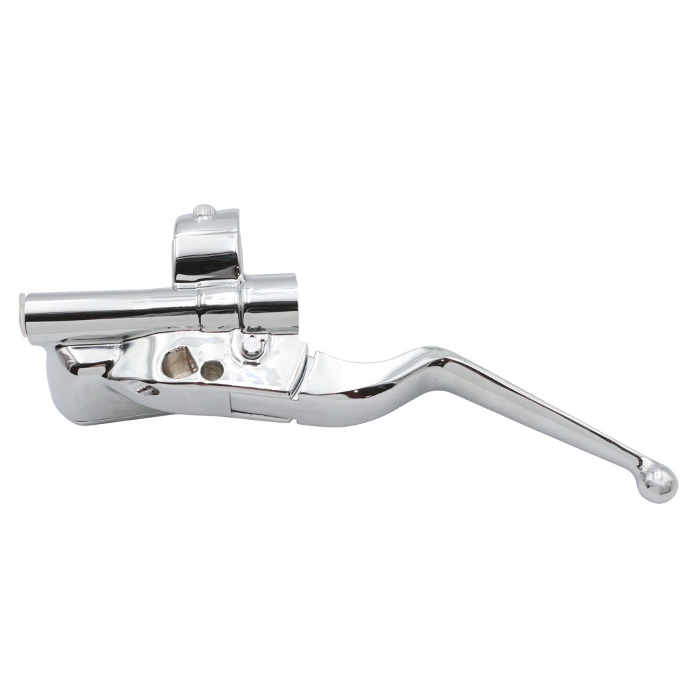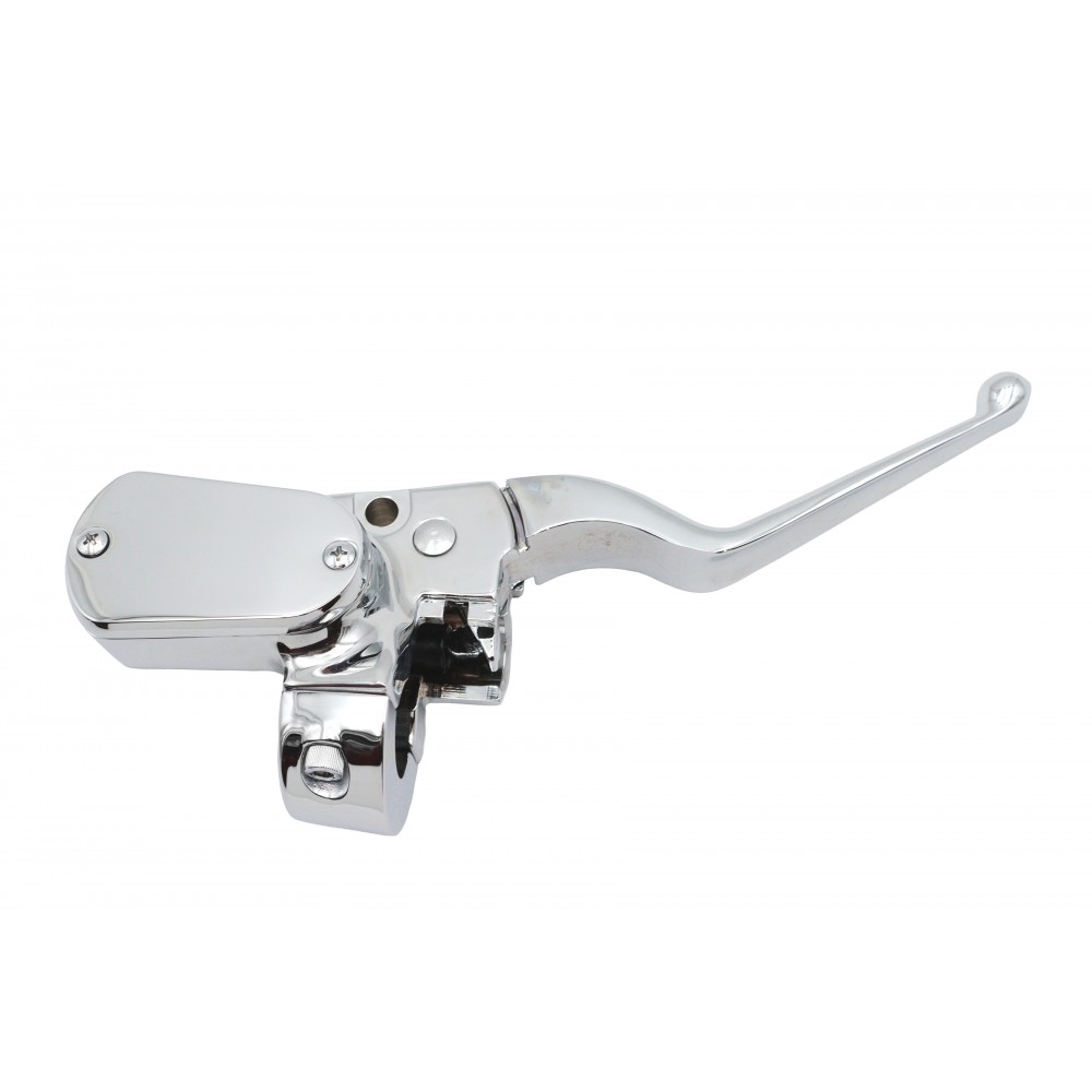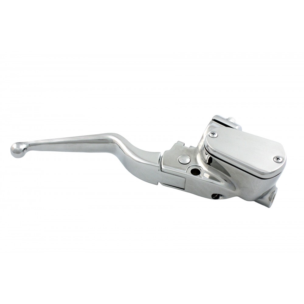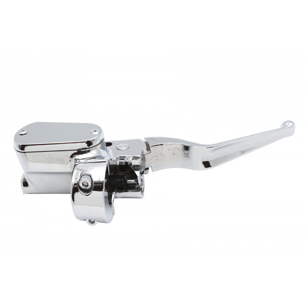 Chrome handlebar master cylinder assembly has a 9/16" bore. Master cylinder comes assembled with internals and lever. For use with single disc caliper.